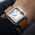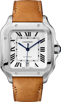 Cartier Santos de Cartier medium model watch with a steel case, silvered opaline dial, and a brown calfskin strap.