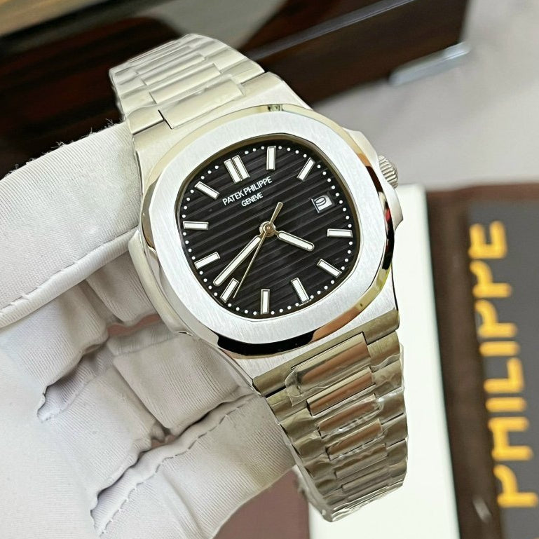 Nautilus watch, an elegant sports watch with a rounded octagonal bezel, porthole case, and embossed dial.